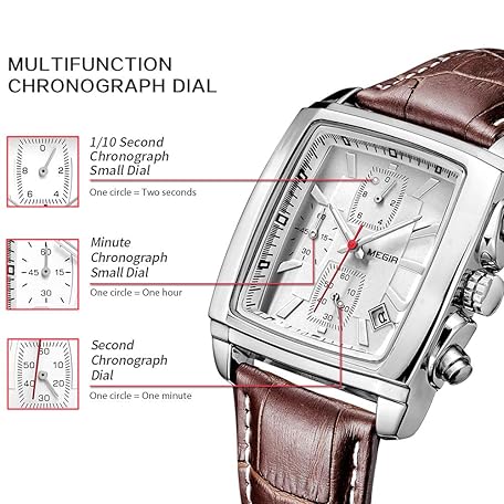 MEGIR Men's Business Analog Fashion Casual Chronograph Rectangle Luminous Quartz Wrist Watch with Brown Leather Strap for Work Sports (2028, White), white