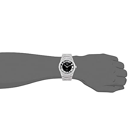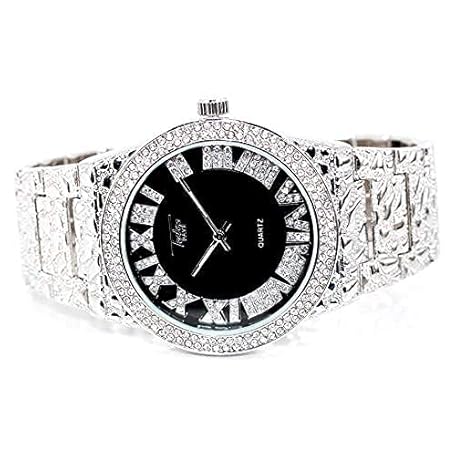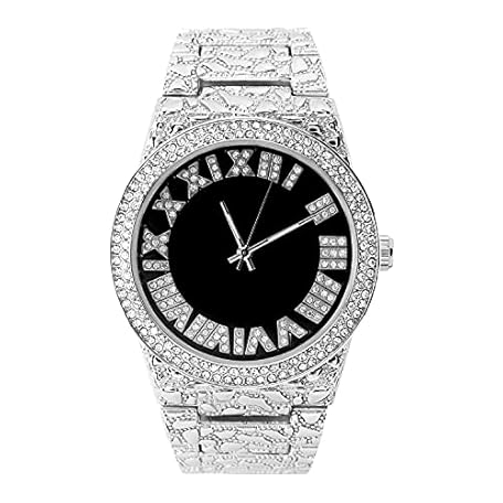 Men's Ice Nugget Band Watch 43mm Diamond Roman Dial and Matching Iced Out Nugget Bracelet - Quartz Movement - 14K Gold Tone Silver and Bracelet Set, Silver / Black, Casual Watch