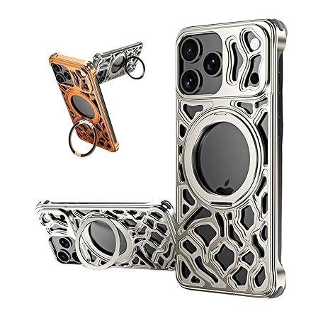 Metal Case for iPhone 17 Pro Max / 17 Pro Aluminum Alloy Bumper Hollow Design Shockproof Military Protective Slim Grip Cover 360° Rotating Camera Stand Camera Protection (Titanium,17Pro)