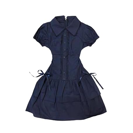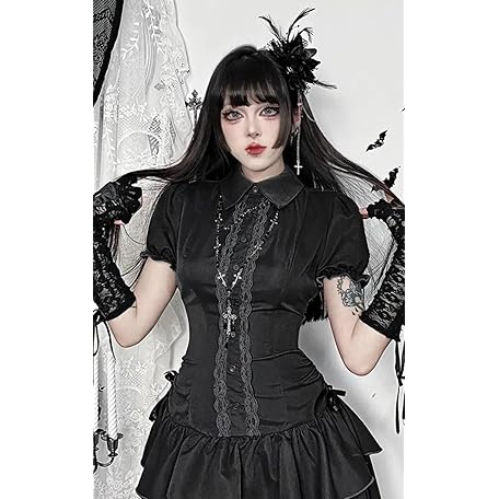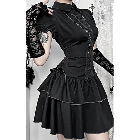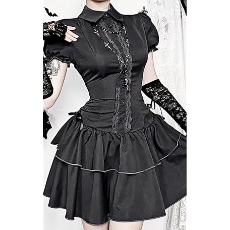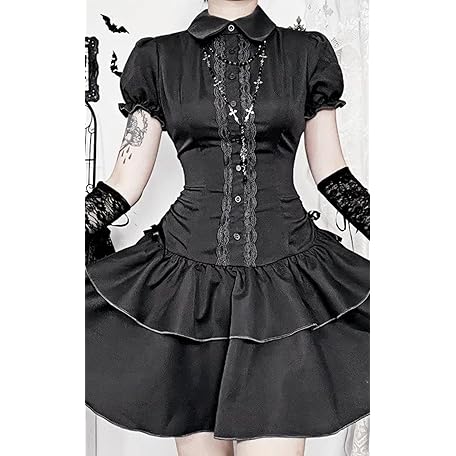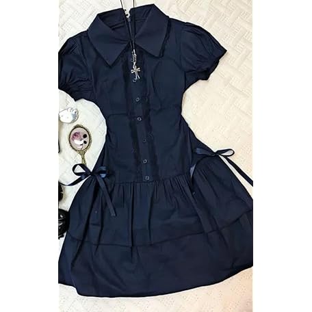 • Misswddd Gothic Lolita Dress, Mini Cosplay, Lolita, Black, Gothic Style, Mine Type, Halloween, Lace, Costume, Short Sleeve, Button, Ribbon, Waist Hug, Puff Sleeve, Small Devil, Adult Costume