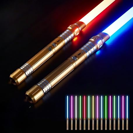• Neakarfer15色発光 LEDライトセーバー 光る剣 サウンド&振動機能 爆閃モード搭載 金属ハンドル 着脱式ブレード USB充電式 大人も子供も楽しめる コスプレ プレゼント 映画 グッズ (15色金色の双剣) [並行輸入品]