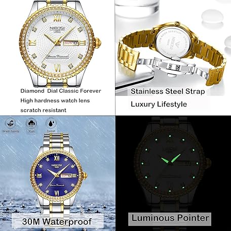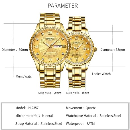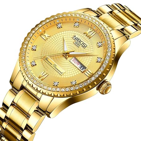 Thông tin sản phẩm NIBOSI Men's Watch, Diamond, Business, Wristwatch, Gentleman, Gold, Waterproof, Analog, Stylish, Classic, Casual, Metal Band, Stainless Steel, Date, Gold Dial, Bracelet Type