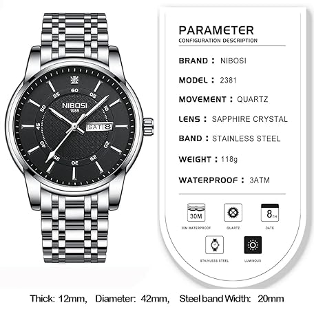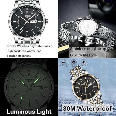 Thông tin sản phẩm NIBOSI Men's Watch, Diamond, Business, Wristwatch, Gentleman, Gold, Waterproof, Analog, Stylish, Classic, Casual, Metal Band, Stainless Steel, Date, Silver strap + black dial, Bracelet Type