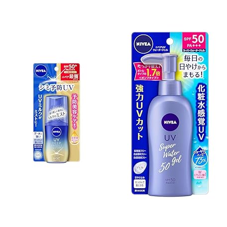 • NIVEA UV Deep Protection & Care Milk Mist, 2.1 fl oz (60 ml), Sunscreen, Stain Prevention, SPF50+ + Nivea Sun Protective Water Gel, SPF50/PA+++, Pump, 4.9 oz (140 g)
