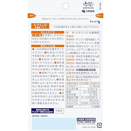 Sản phẩm Official Kobayashi Pharmaceutical Vitamin D Lactic Acid Bacteria Plus Supplement (Keeps Your Body Healthy Every Day) Vitamin D Supplement [Dietary Supplement / 30 Tablets / Approx. 30 Days] đang được bán với giá ưu đãi là $6.3329 tại nước Nhật.
