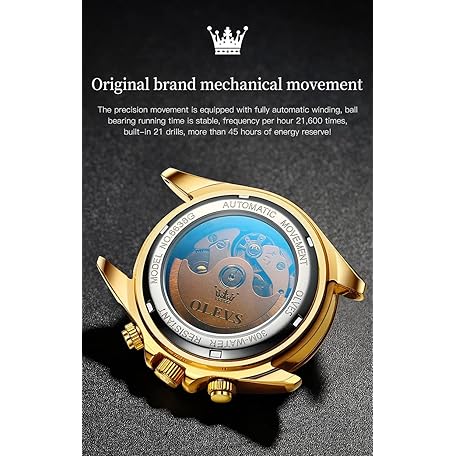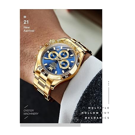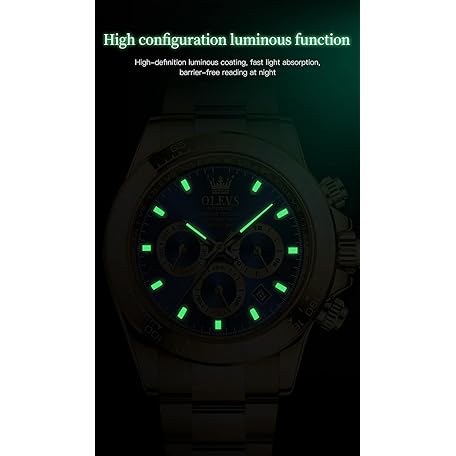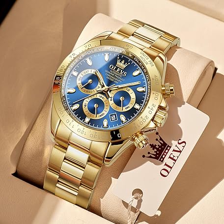 OLEVS 自動ゴールドウォッチ メンズ ラグジュアリー クラシック ステンレススチール カレンダー 発光 防水 腕時計 男性用, ゴールドストラップ&ブルーダイヤル。, ブレスレット