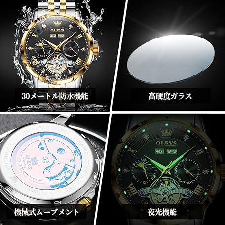 Sản phẩm OLEVS Men's Mechanical Automatic Moon Phase Wristwatch, Stylish, Luxury, Date, Skeleton Style, Waterproof, Popular, Luminous Watch for Men, black and gold, Bracelet Type đang được bán với giá ưu đãi là $92.6936 tại nước Nhật.
