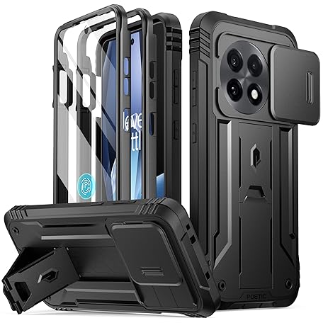 • OnePlus 13R 5G用Poetic Revolutionケース、[スライドカメラカバー]、内蔵スクリーンプロテクター[指紋ID対応]、[2つのフロントフレーム]キックスタンド付きフルボディ頑丈な耐衝撃ケース、ブラック