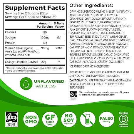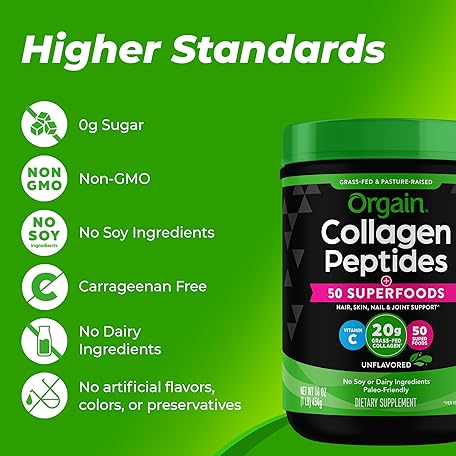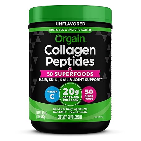 Orgain Hydrolyzed Collagen Peptides Powder + Superfoods, 20g Grass Fed Collagen - Hair, Skin, Nail, & Joint Support Supplement, Paleo & Keto, Non-GMO, Type I and III, 1lb (Packaging May Vary)