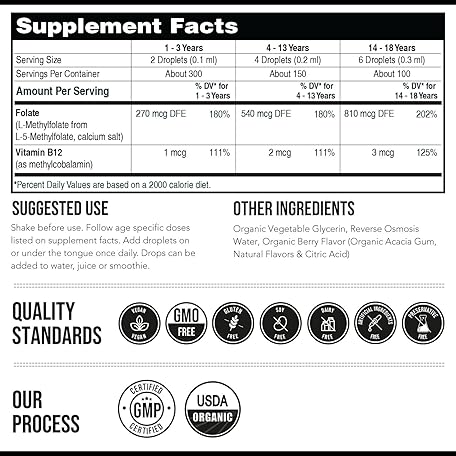 Thông tin sản phẩm Organic Kids Methyl Folate + Methyl B12 Cofactor - Organic Berry Flavor, Sublingual Foam - 5-MTHF Foam, Excellent Form of Folic Acid - Adjustable Dosage for All Ages - Mood, Behavior, and Cognition