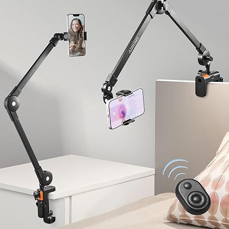 Phone Holder for Desk Bed, Overhead Phone Mount with Wireless Remote, Flexible Phone Stand Lazy Bracket Mount Long Arms Clamp Clip for iPhone, Samsung, Google Pixel, Moto