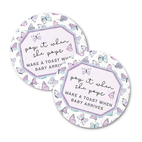 Pop It When She Pops Butterflyタグ | 30個パック、2.5インチ パープルラベル シャンパンミニボトル用 ピンク バブリーフェイバーハング ベビーシャワーや性別披露用
