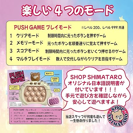 Thương hiệu SHOP SHIMATARO là cái tên nổi tiếng được rất nhiều khách hàng trên thế giới chọn lựa. Với kiểu dáng đẹp mắt, sang trọng, sản phẩm Push Pop Game, Educational Toy, Glowing, Fast Press Bodan, Electric Game, Squeeze, Concentration, Stress Relief, Fingertip Education (Bear Design) là sự lựa chọn hoàn hảo nếu bạn đang tìm mua một món cho riêng mình.