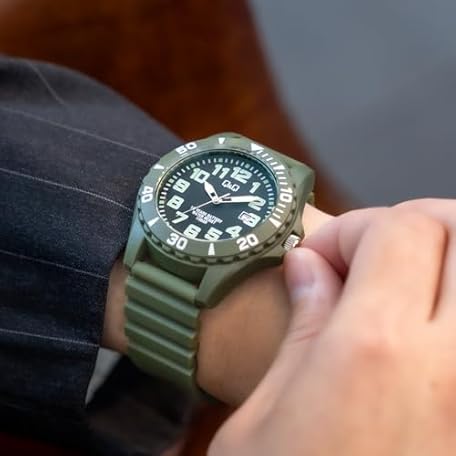 Thông tin sản phẩm Q&Q(キューアンドキュー) Citizen Q&Q A22A Analog Wristwatch, Battery Life, 10 Years, Water Resistant to 10 ATM, Date, Urethane Band, Khaki, Classic