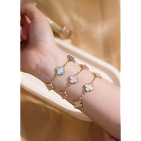 RADIANT REVIVE 本物のマザーオブパールの四つ葉のクローバーブレスレット、18Kゴールドメッキの上品なジュエリー、幸運のチャームの女性へのギフト(パールホワイト/オーシャンブルー/スイートライラック)