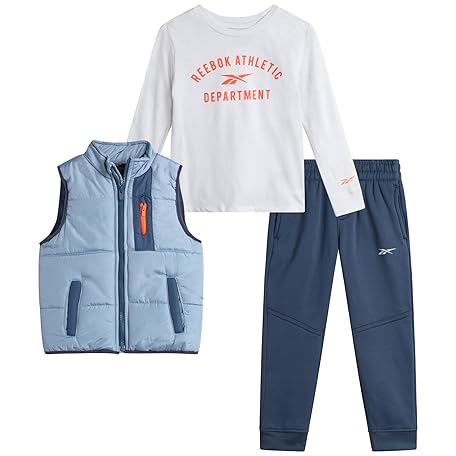 Reebok ボーイズ アスレチックセット - ジップパファーベスト、長袖ジャージーTシャツ、フリースジョガーパンツ3点 幼児/男の子用(12M-7), ダスティブルー, 5