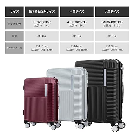 Mặt hàng này hiện nay đang có các phân loại D.GRAPHITE, DARK RED, SILVER, S(機内持ち込み)/1-3泊, Mサイズ(4-6泊),  cho bạn nhiều sự lựa chọn phù hợp với cá tính và sở thích riêng của mình. Dự kiến hàng sẽ về đến Việt Nam từ 01-01-1970 đến 01-01-1970 nếu quý khách thực hiện thanh toán trong hôm nay.