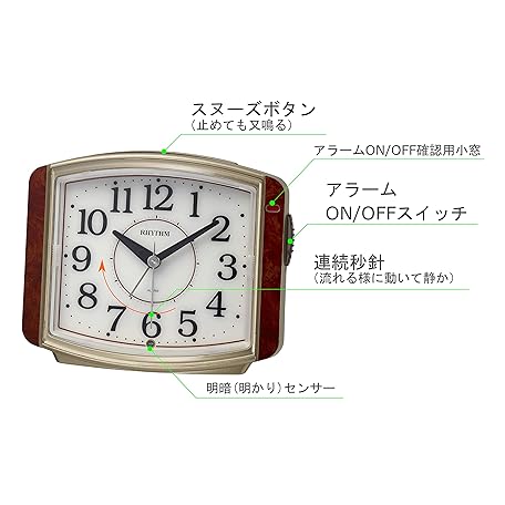 Thông tin sản phẩm RHYTHM 8RE644SR23 Alarm Clock, Analog, Electronic Sound Alarm, Dark Place, Light, Automatic Lighting, Continuous Second Hand, Brown, 4.3 x 5.4 x 2.9 inches (11.1 x 13.7 x 7.3 cm)