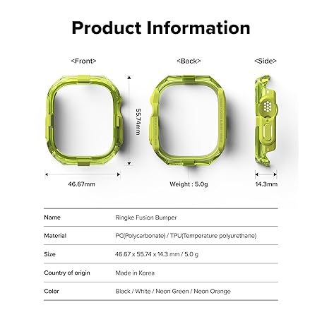 Thông tin sản phẩm Ringke Apple Watch Ultra 2 / 1 Case, FUSION BUMPER PC+TPU Material, Anti-Yellowing, Shockproof, Shock Absorption, Protective Case, Apple Watch Ultra 2 / 1 Generation, Smartwatch, Bumper Case - Neon