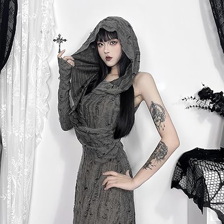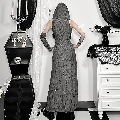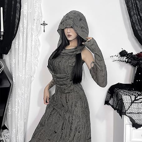 SENMHS Gray Gothic Lolita Hooded All-in-One Dress, Sexy, Gothic Style, Women's Dress, Lolita, Cosplay, China-Style, Costume, Cultural Festivals, Gray Dress, Gloves Included