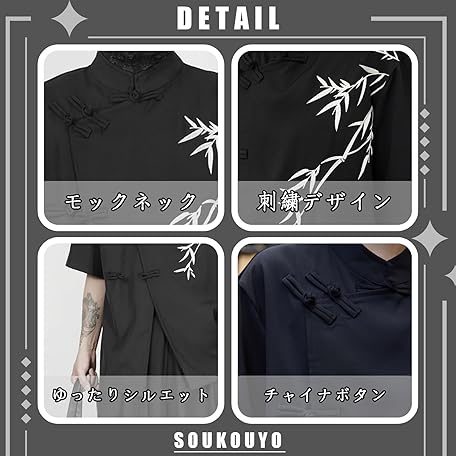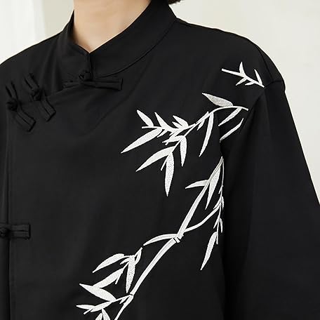 Thông tin sản phẩm SOUKOUYO Men's China Clothing, Mock Neck, Short Sleeve T-shirt, Embroidery, Bamboo Pattern, Irregular, China Button, Thin, Breathable, Standing Collar, Kung Fu Clothing, Summer, Black, L