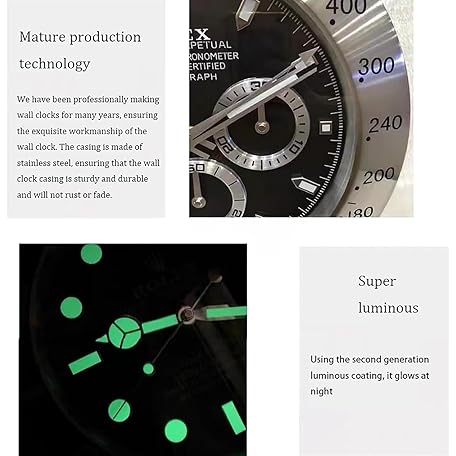 Thông tin sản phẩm Ssymjh Wall Clock Radio Quiet Silver Rolex Daytona Luminous Clock for Living Room, Kitchen & Office, Built-in Thermometer & Hygrometer, Silent Wall Clock (G)