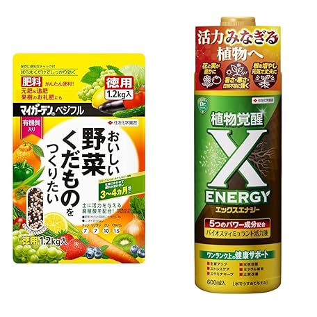 Sumitomo Chemical Gardening Fertilizer, My Garden, Veggy, 2.6 lbs (1.2 kg), Granular, Vegetables, Fruit Trees, Fruits, Fruit + Biostimulant Vitality Liquid, X-ENERGY 23.1 fl oz (600 ml), Flowers