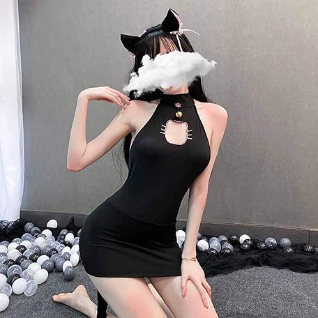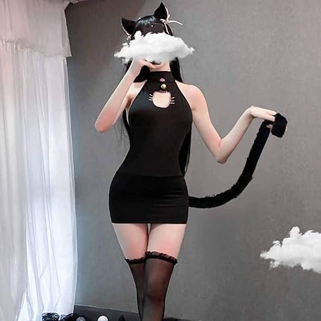 • 女性のセクシーな猫のコスプレ ランジェリー ハロウィン アニメ子猫コスチューム衣装ベビードール ナイトウェア セット下着子猫パジャマ ドレス + ヘッドバンド + 取り外し可能なしっぽ + Tバック (ブラック)
