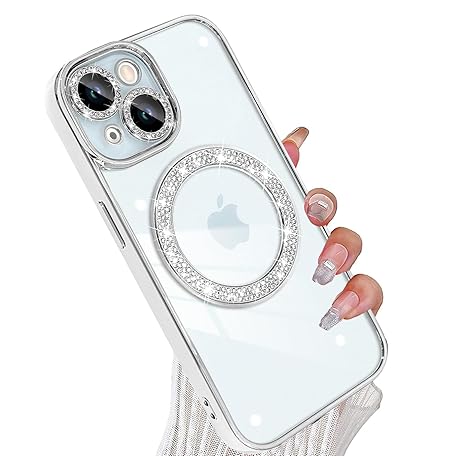 • tharlet マグネット式 iPhone 15用 ケース [Magsafe対応] クリア ハード バック フレーム グリッター ラグジュアリー メッキ キラキラ クリア スマホケース 15用、シルバー(6.1インチ)