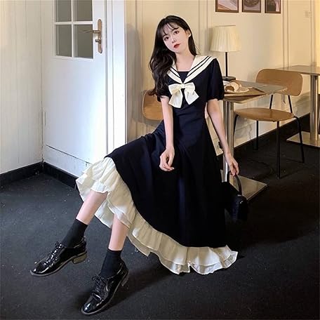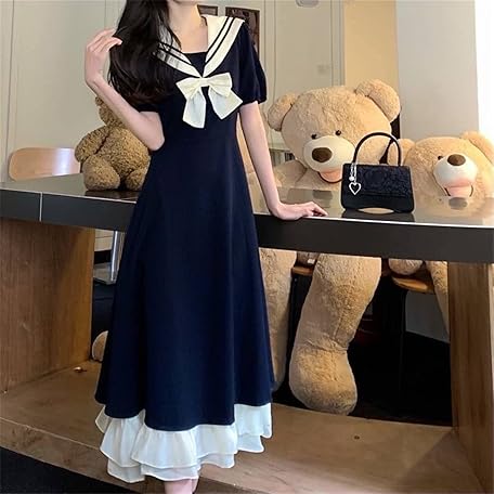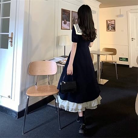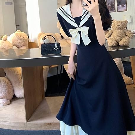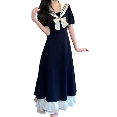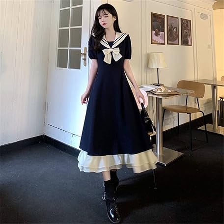 Sản phẩm TKSYS Lolita Kawaii Dress ロリータ ドレス甘い弓襟カレッジ スタイル ロング スカート女性の夏プラス サイズ半袖フリル (Color : Navy, Size : L) đang được bán với giá ưu đãi là $33.4521 tại nước Nhật.