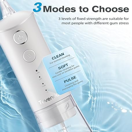 Thông tin sản phẩm TOVENDOR Water Dental Flosser, Rechargeable Dental Oral Cleaner, 3 Modes, 5 Tips for Cleaning Teeth, Family Oral Hygiene, Portable, 300ml, Large Water Tank Water Flosser, IPX7 Waterproof (White)
