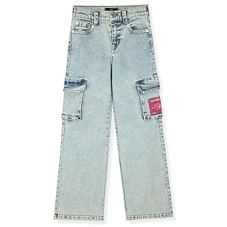 True Religion ガールズファッションジーンズ – プレミアムデザイナーデニムパンツ キッズ用、ワイドレッグ、カーゴ、フレア(サイズ7-14), ライトブルーカーゴ, 7
