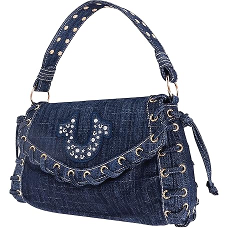 True Religion スタッズ ホースシュー アイレット デニム フラップバッグ、クロスボディ ショルダー ハンドバッグ、ロゴとスタッドディテール、ダークデニム