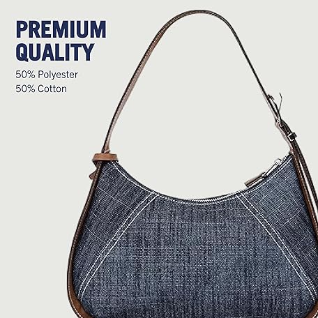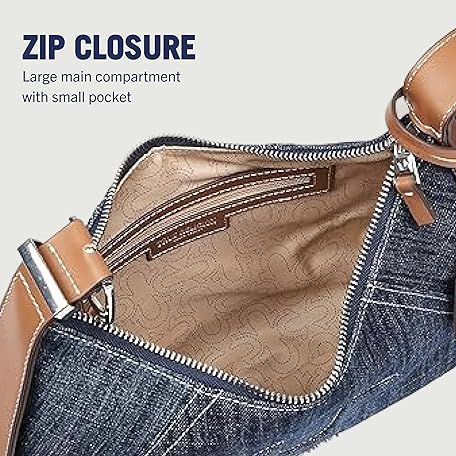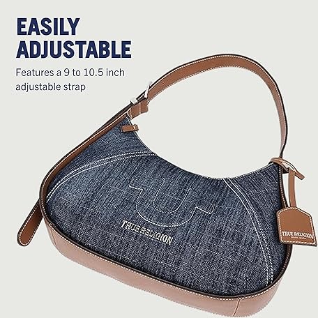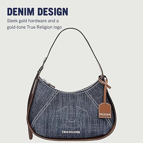 True Religion ホーボーバッグ、ジッパー開閉式ショルダーパース、調節可能なハンドルドロップ付き、シルバーハードウェアとシグネチャーライニング、デニムブルー