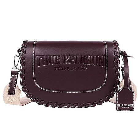 • True Religion サドルバッグ、ホイップステッチフラップクロスボディパース、ワイドロゴストラップとマグネットクロージャー、ワイン