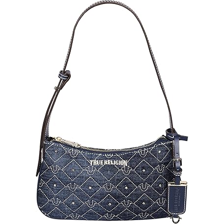 • True Religionショルダーバッグ、スタッズデニムパース、キルト馬蹄パターン、調節可能なストラップとゴールドハードウェア、ダークデニム