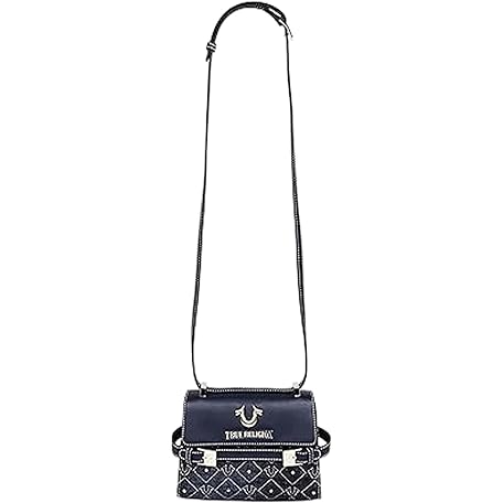 • True Religion クロスボディバッグ、スタッドフラップパース、ダイヤモンドステッチパターン、馬蹄ロゴ、シルバーハードウェア、ダークデニム