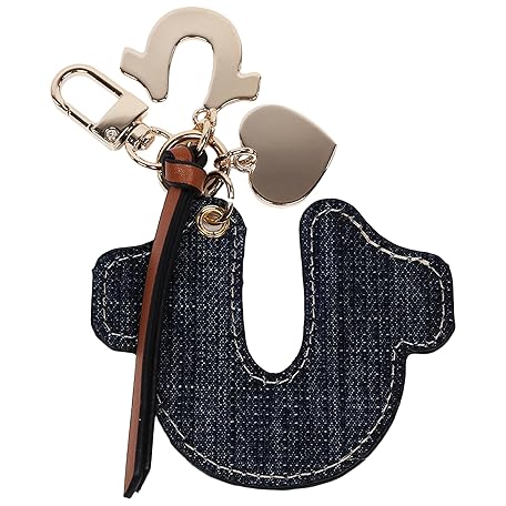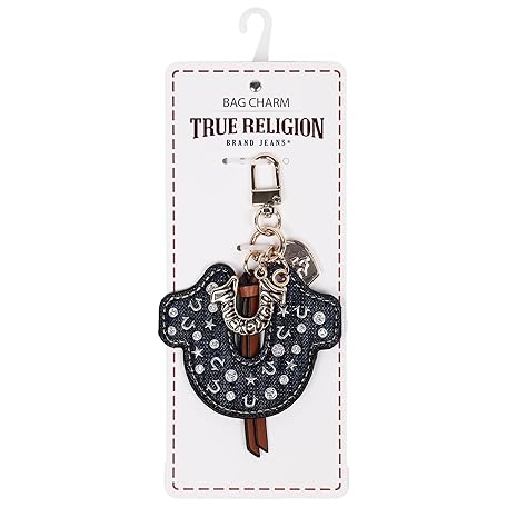 True Religion デニム馬蹄バッグチャーム、ハートペンダントとアクセントストラップ付きゴールドハードウェアキーチェーン、ダークデニム