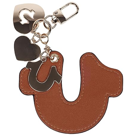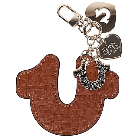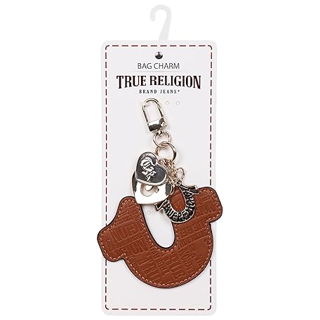 True Religion エンボス加工の蹄鉄バッグチャーム、ハートペンダントとロゴディテール付きゴールドハードウェアキーチェーン、コニャック