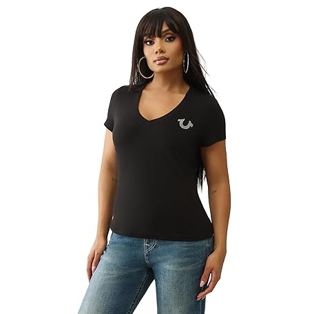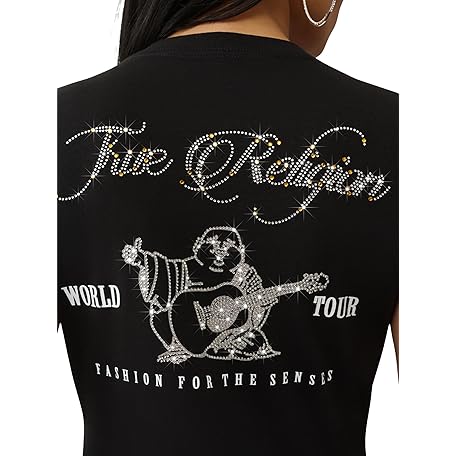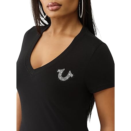 • True Religion Crystal Buddha Vネック Tシャツ 女性用 – グラフィック 半袖 コットンブレンド トップ