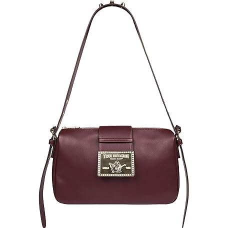 True Religion East West クロスボディハンドバッグ、ベルトバックルアクセントショルダーパース、調節可能なストラップとスナップジップクロージャー、ゴールドトーンロゴ、バーガンディ