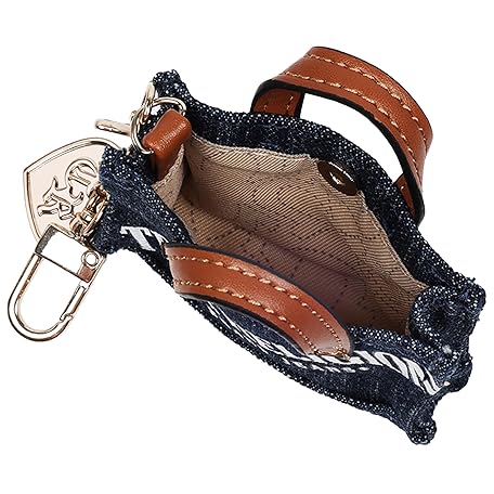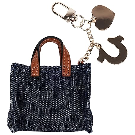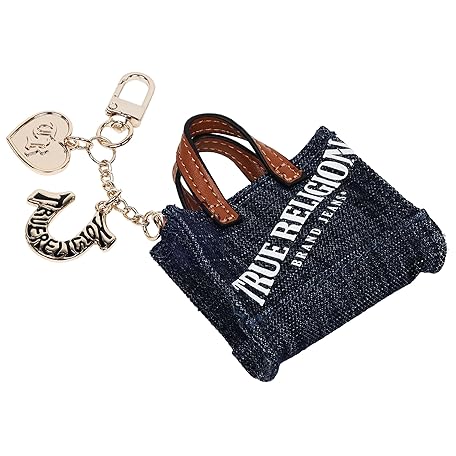 True Religion Mini Denim Tote Bag Charm, Gold Hardware Keychain with Heart and Horseshoe Pendant, Brown Handle, Dark Denim