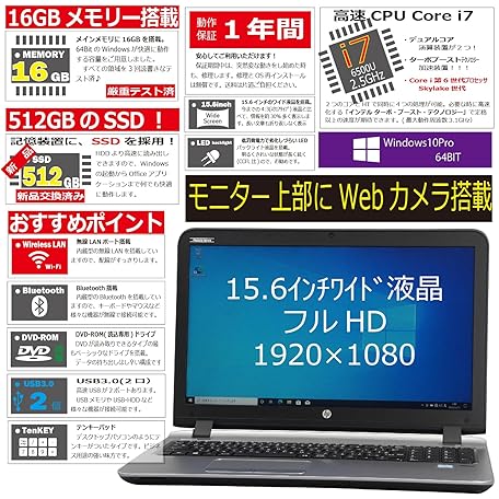 • Used PC, HP ProBook 450 G3, Windows10, Laptop, 6th Generation, Core i7, 6500U, 2.5 (~3.1 Max) GHz, MEM: 16 GB SSD: 512 GB DVD-ROM, Wireless LAN: Yes, Full HD Webcam, Built-In Numeric Keypad,