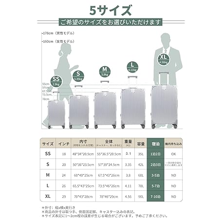 Mặt hàng này hiện nay đang có các phân loại シルバー, ブラック, ホワイト, 新S-20インチ (56*36*23cm,機内), 新サイズ M~22インチ (63*42*25.5cm), M-24インチ (67.5*43*26cm), SS (55*36*22cm) 機内、全ての航空会社に適用, L (73.5*46*26cm), XL (78*46*29cm),  cho bạn nhiều sự lựa chọn phù hợp với cá tính và sở thích riêng của mình. Dự kiến hàng sẽ về đến Việt Nam từ 01-01-1970 đến 01-01-1970 nếu quý khách thực hiện thanh toán trong hôm nay.