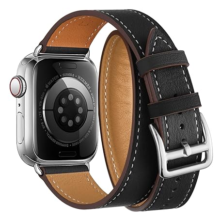 Thông tin sản phẩm WFEAGL Apple Watch Compatible Band, Genuine Leather, iWatch Series 6 / 5 / 4 / 3 / 2 / 1, SE, Leather Band, Replacement Strap for Sport Edition, 1.5 - 1.6 inches (38 - 40 mm), Double Winding (Black + Silver Adapter)
