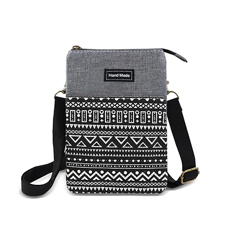WisePoint レディース クロスボディバッグ、コットン クロスボディ 携帯電話バッグ カジュアル ショルダーバッグ 女性用 ボーホー 携帯電話バッグ, ブラックグレー