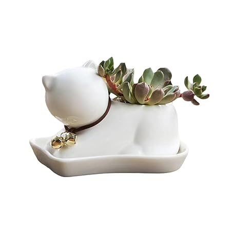 WQKING 猫 多肉植物 プランター 装飾動物プランター ミニ漫画 セラミック草プランターボックス トレイ付き クロックポット(ホワイト)