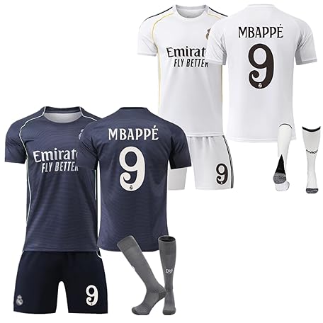 [YINGT] Soccer Uniforms 25-26 Newest Real Madrid Home+Away Mbappe Soccer Uniforms #9 Mbappe Adult and Kids Practice Wear Sports Shirt Top and Bottom Set with Socks, #9 away, S