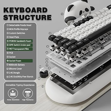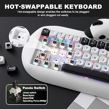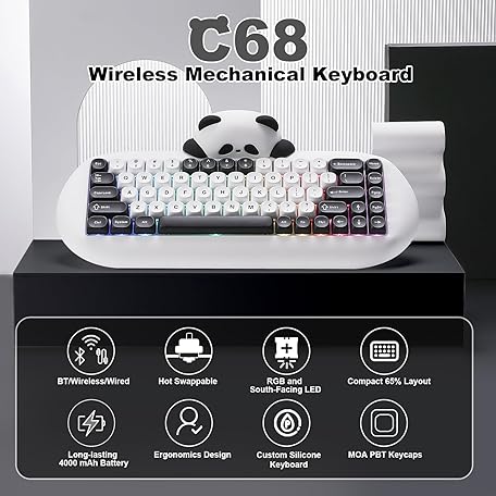 Thông tin sản phẩm YUNZII C68 Wireless Mechanical Keyboard, Cute Panda, 65% Wireless, Hot Swap, Silicone, Ergonomic Gaming Keyboard, 3 Modes, BT5.0/2.4G/Wired RGB Backlight, NKRO Win/Mac Certified (Panda Switch, White)