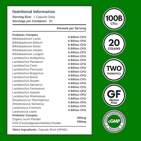 Thông tin sản phẩm 100 Billion CFU Probiotics - 20 Unique Strains + Organic Prebiotics | Gut Health, PH Balance, and Digestion | Scientifically Proven Probiotics for Women and Men – 60 Day Supply – Made in The UK